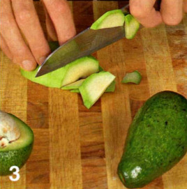 3 . Авокадо разрежьте пополам, удалить косточку. Аккуратно очистить от кожицы. Нарежьте мякоть тонкими ломтиками и сбрызнуть соком лимона.